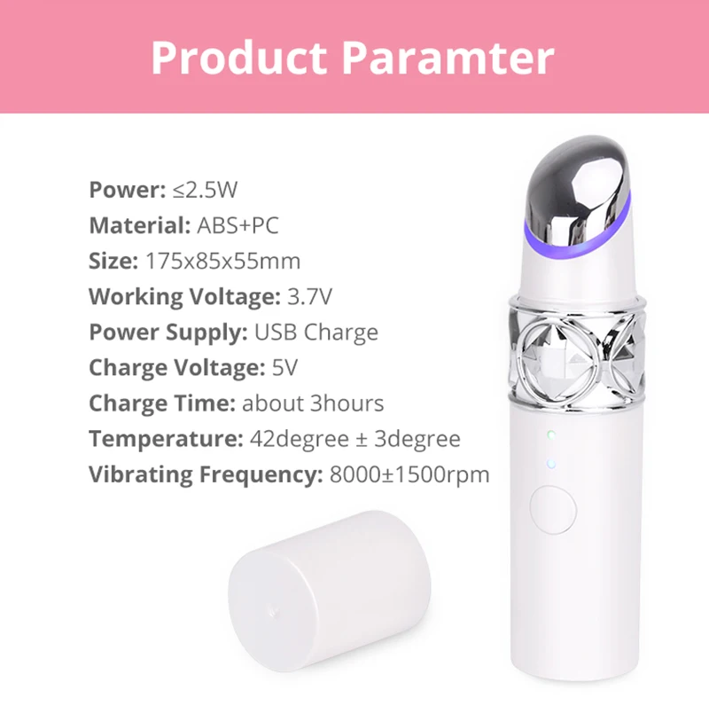 Cor: rosa, branco Tamanho do produto: 18*2,5cm Tamanho da caixa de cor: 17*8*5cm Capacidade da bateria: 300mAh Potência: 2,5W Tensão: 5V Certificação: Patente de aparência + relatório de inspeção de qualidade Frequência vibração: 8000 (±1500) rpm